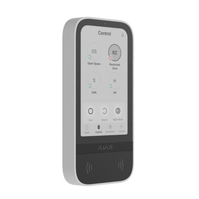 AJAX KeyPad TouchScreen WH 5'' vezeték nélküli érintőképernyős billentyűzet beépített RFID olvasóval (Mifare DESIFire) és Bluetooth, lehetővé teszi a rendszer élesítését, részleges élesítését, hatástalanítást, kimenetvezérlést és pánikriasztást. LED jelzés. Beépített hangjelző a késleltetés jelzésére. Kijelző: 5'' IPS, felbontás: 480 × 854px, Maximális távolság: 1700 m, Tápellátás: 6 × AA, Szín: fehér. Méret: 172 × 82 × 26 mm, Működési hőmérséklet: -10°C to +40°C - Kompatibilitás: Hub 2 (2G), Hub 2 (4G), Hub 2 Plus, Hub Hybrid (2G), Hub Hybrid (4G), REX2.