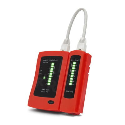 A kábeltesztelő műszer RJ11, RJ12 és RJ45 (UTP) csatlakozóval szerelt vezetékek tesztelésére. Funkciók: rövidzárlat, szakadás, keresztbekötés megállapítása. A lassú és gyors teszt funkció, valamint az eltávolítható kontroll egység nagyban megkönnyíti a műszer használatát. Méret: 105 x 100 x 28 mm. Tartozék: hordtáska, elem (1 x 9V)